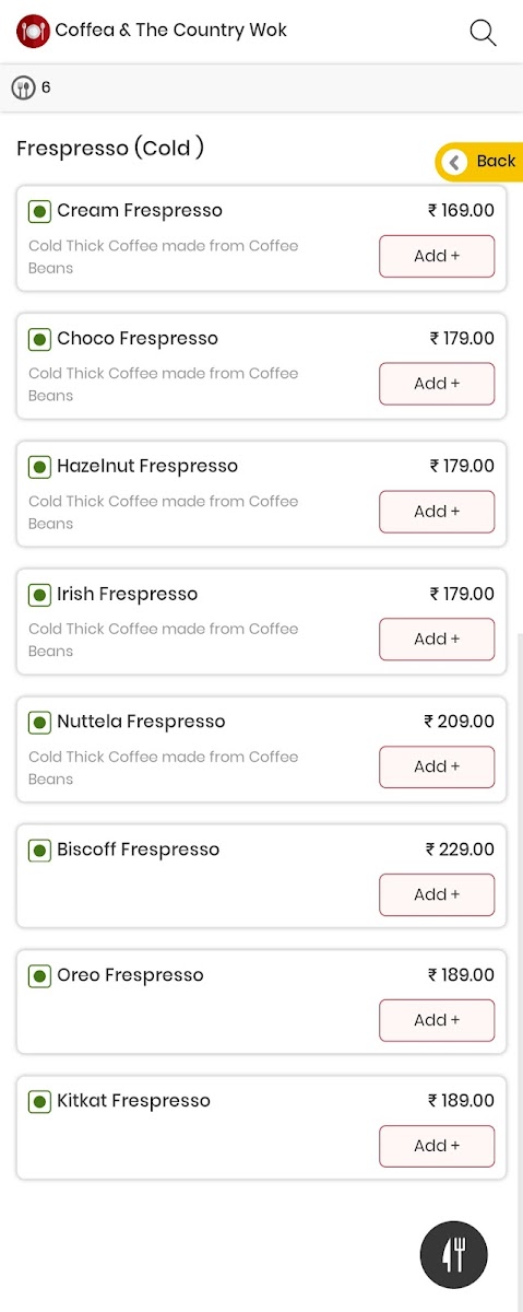 The menu structure accommodates casual dining with a focus on quick orders and light meals, making it suitable for coffee breaks, casual meetups, or light lunches. Both food and beverages are presented in a way that allows easy selection for visitors seeking either a coffee-focused experience or a combination of food and drinks.